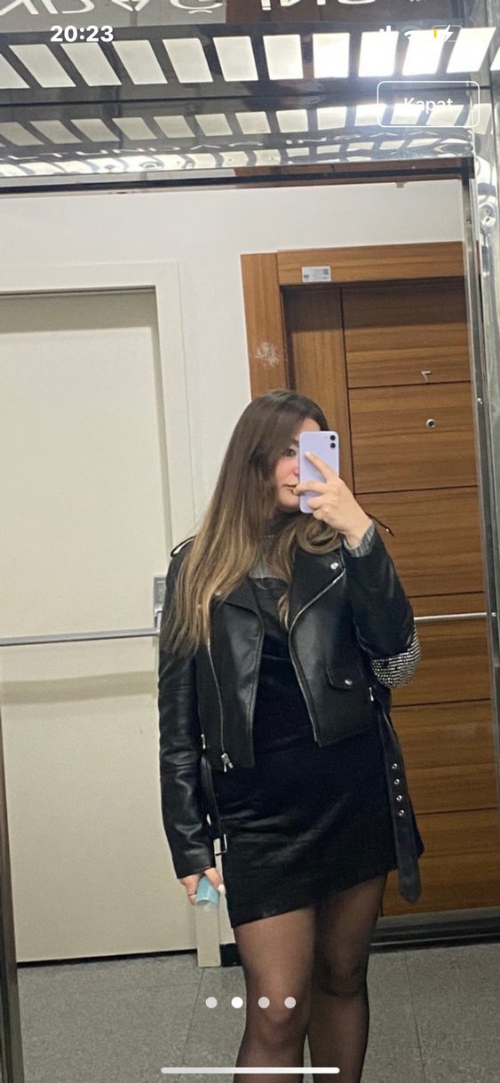 Siyah, fitted kadın deri biker ceket, yakasında notch ve tokalı detaylar bulunur. Deri, kemerli ve çizgili detaylara sahip, uzun kollu, kesimli siyah kadın ceket. Sokak stiline uygun. Boynunda dökülme var mı fotoğrafta belirttim arkada oldugu için görünmüyor onun dışında kusuru yoktur