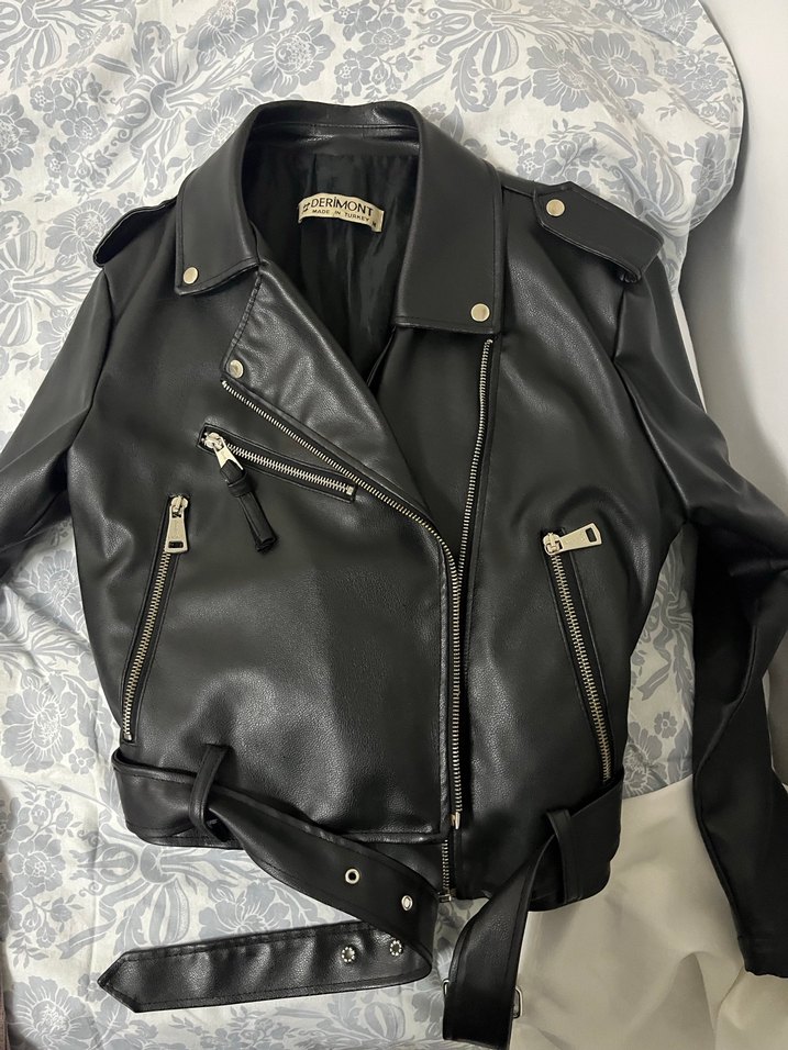 Siyah deri biker ceket, oturan kesim, kesik yaka, askılı kollar ve tokalı detaylarla. Günlük kullanıma uygun, trend casual tarzda. ense ve bilek kısımlarında resimdeki gibi deforme var