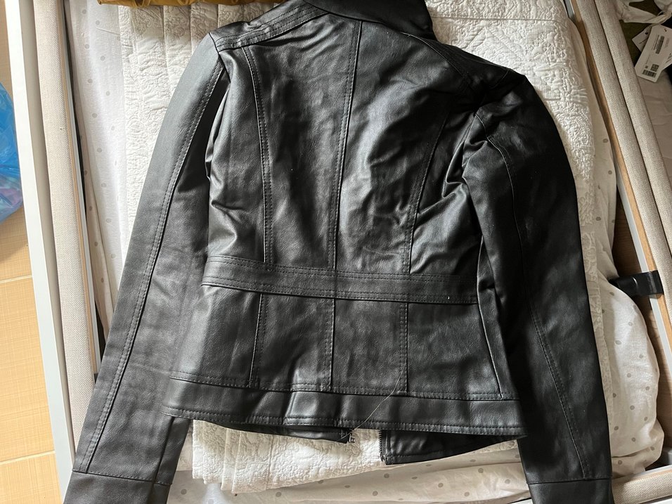 Kadınlar için siyah deri biker ceket, oturan ve midi boyda, kesik yaka ve tokalı detaylara sahip. Günlük kullanıma uygun, trend sokak stiline uyumlu.