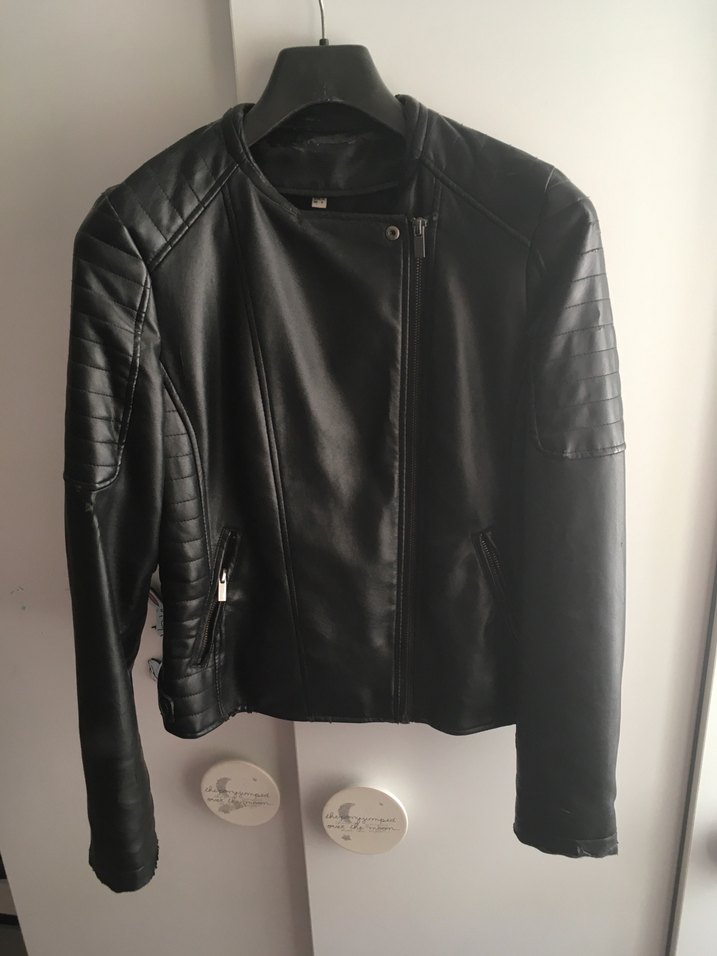 Fitted kesim siyah deri biker ceket, yakasında çıtçıtlı detaylar bulunur. Uzun kollu ve normal midi boydadır, günlük kullanıma uygundur.