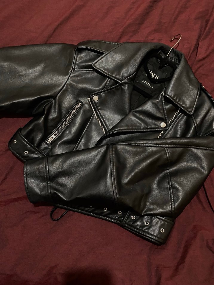 Siyah, deri, fitted biker ceket, yakasında keskin detaylar ve tokalı özelliklerle rock punk havası sunar.