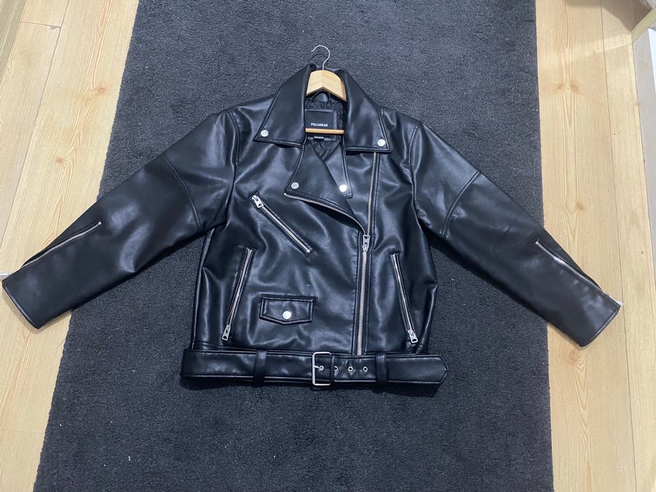 Siyah deri biker ceket, kemerli ve çıtçıtlı yaka detaylıdır. Midi boy, rahat kesimdir. Günlük kullanıma uygundur. HİÇ GİYİLMEDİ YENİ!