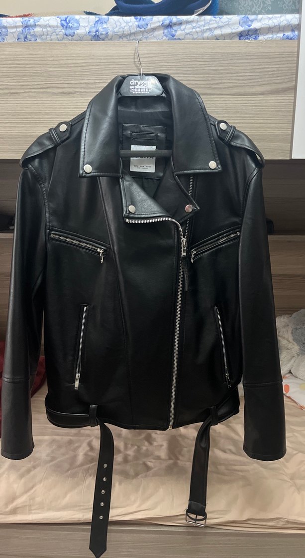 Füme siyah deri, kemerli ve fermuarlı ceplere sahip, yakalı ve askılı kollu biker ceket. Normal midi uzunlukta, sokak stiline uygun.