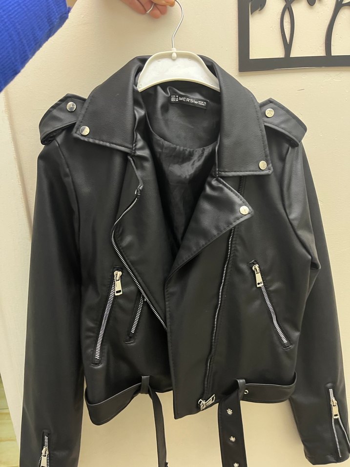 Siyah deri biker ceket, dar kesim ve yakalıdır. Tokalı detaylar ve askılı kollar, orta boy uzunlukta, fermuarlı ceplidir. En ufak bir sorunu yoktur . Yeni gibi. Marka temsilidir .