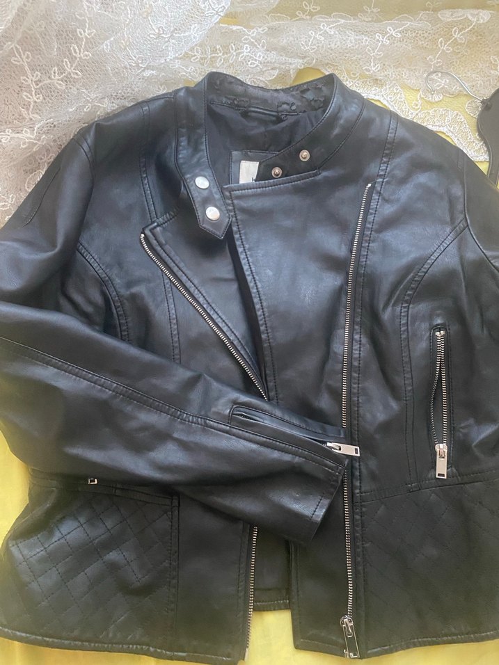 Fitted kesim, siyah deri biker ceket, çıtçıtlı yakalı, fermuarlı ve askılı kolludur. Parlak yüzeye ve normal midi uzunluğa sahiptir. Defo fotoğrafta gösterildi