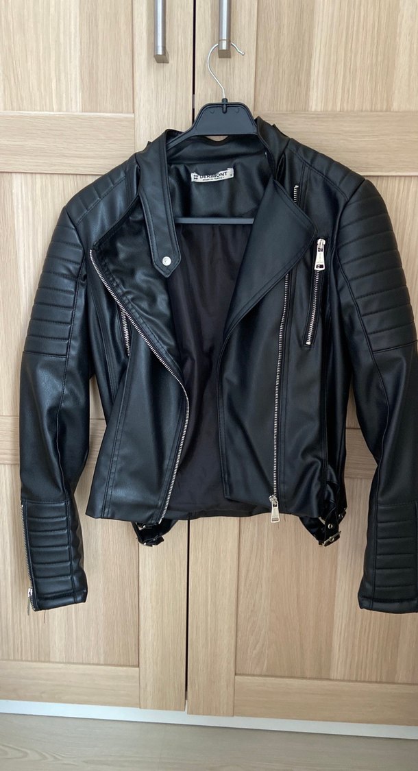 Dar kesim siyah kadın deri biker ceket, kesik yakalı, askılı kollu ve tokalı detaylara sahip, günlük kullanım için trend Paris tarzını yansıtıyor.