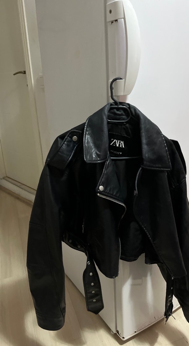 Kadın siyah deri biker ceket, kemerli detaylar ve kesik yakasıyla, askılı kollu ve normal boyda, günlük kullanım için uygun. Ürünün kollarında ve yakasında aşınmalar var belirtildiği üzre