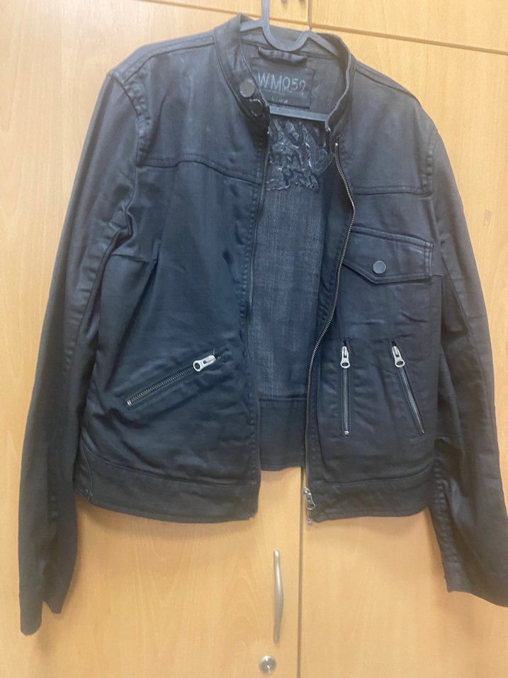 Kadın siyah deri biker ceket, düz kesim, çıtçıtlı yaka ve fermuarlı ceplerle. Denim kumaştan, uzun kollu ve normal boyda, günlük kullanım için uygun.