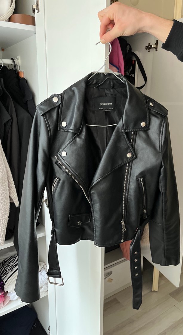 stradivarius siyah, deri biker ceket ense kisminda fotografta gozuktugu gibi asinma var uygun fiyata veriyorum