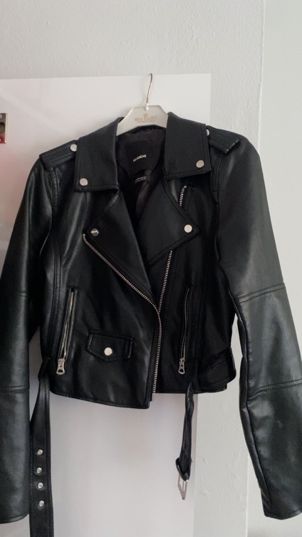 Siyah deri, fitted kesim biker ceket. Askılı kollu ve yaka detaylı, kemerli ve fermuarlı tasarıma sahip, rock punk tarzını yansıtır.