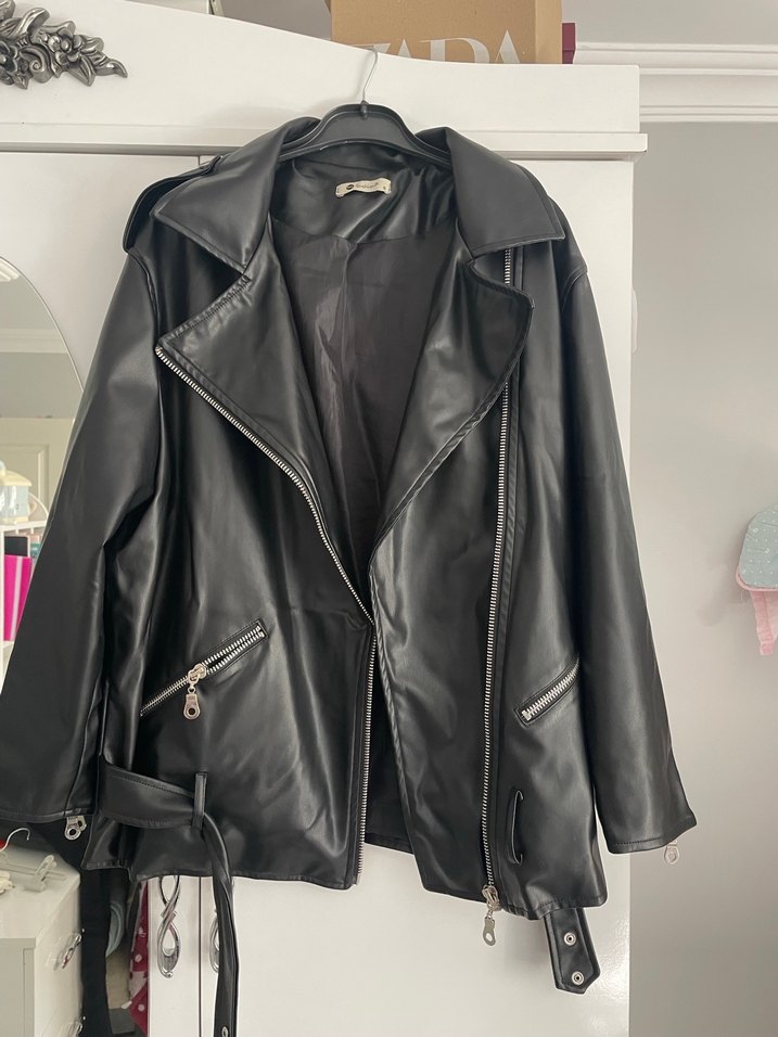 Siyah deri, bol kesim biker ceket. Kemer detaylı, yakası kesik ve askılı kollu, günlük kullanıma uygun.