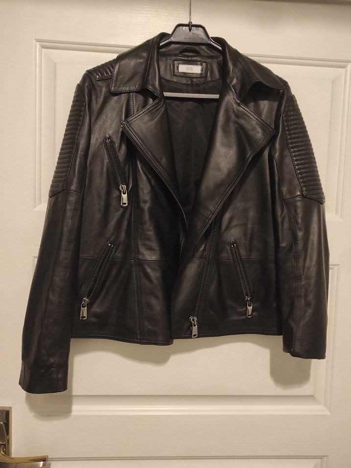 Siyah deri biker ceket, fitted kesim, kesik yaka, tokalı detaylar ve fermuarlı ceplerle. Kayışlı kollara ve normal midi boy uzunluğuna sahip, günlük kullanıma uygun rock punk havasında.