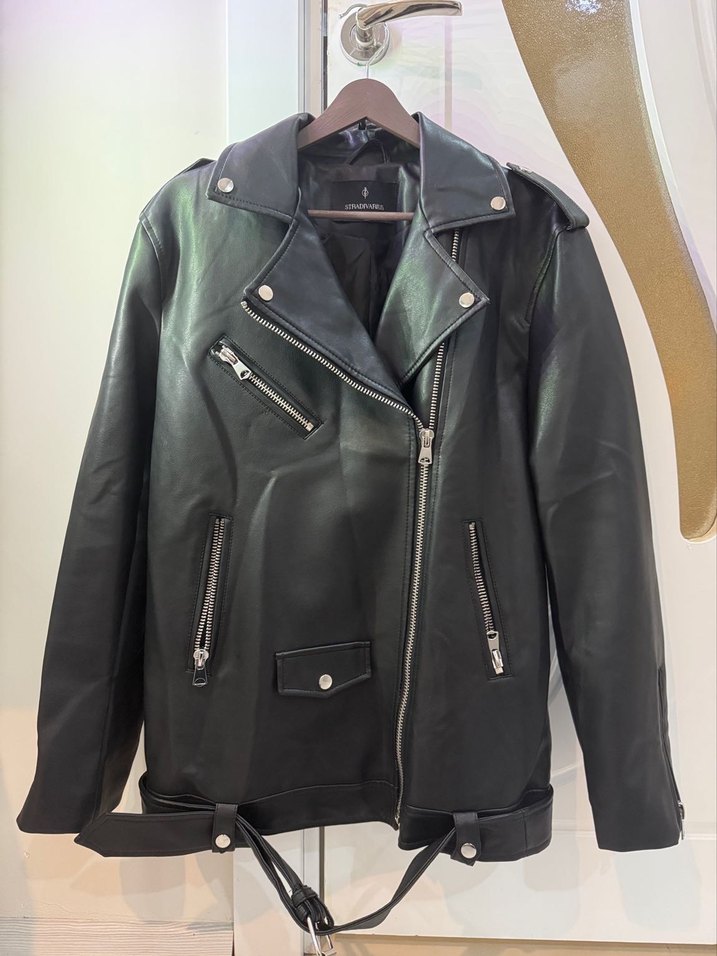 Siyah deri biker ceket, çentikli yaka ve fermuarlı ceplere sahip. Normal kesim, askılı kollar ve midi boyuyla günlük kullanıma uygundur. Sıfır ürün. Beden olmadığı için satıyorum. Bir kere bile giyilmedi.
