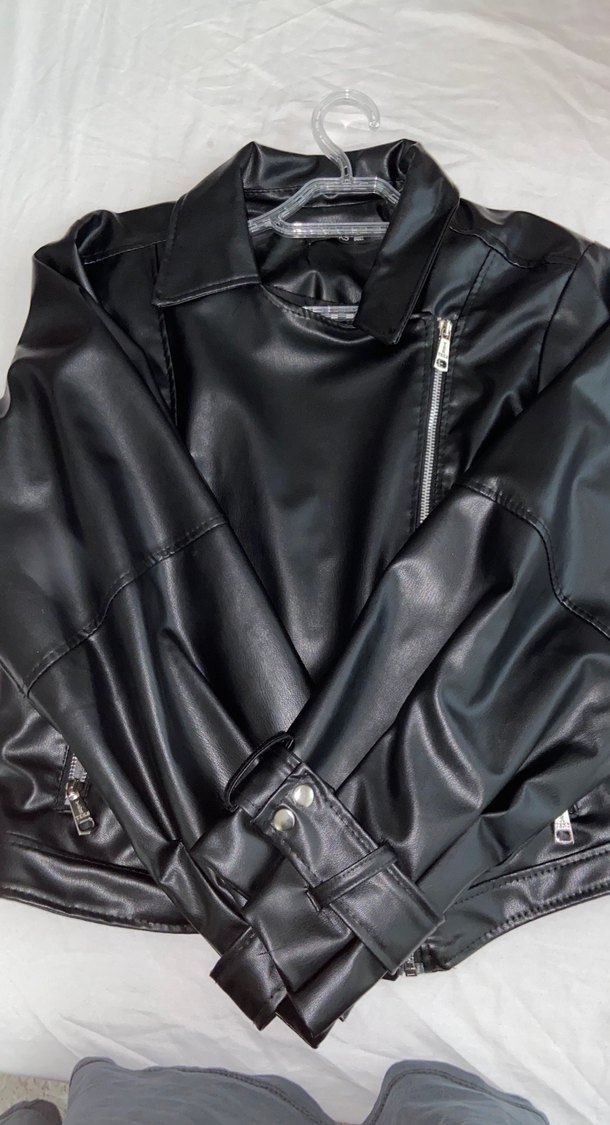 Siyah deri biker ceket, yakasında kesik yaka ve fermuar detayları bulunur. Askılı kollu, dar kesim midi uzunlukta, grunge punk tarzında günlük kullanıma uygun.