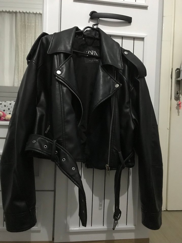 Siyah deri biker ceket, fitted kesim, yakasında notched lapel ve tokalı detaylar bulunur. Strappy kollu ve midi boyda, rock punk tarzına uygun.