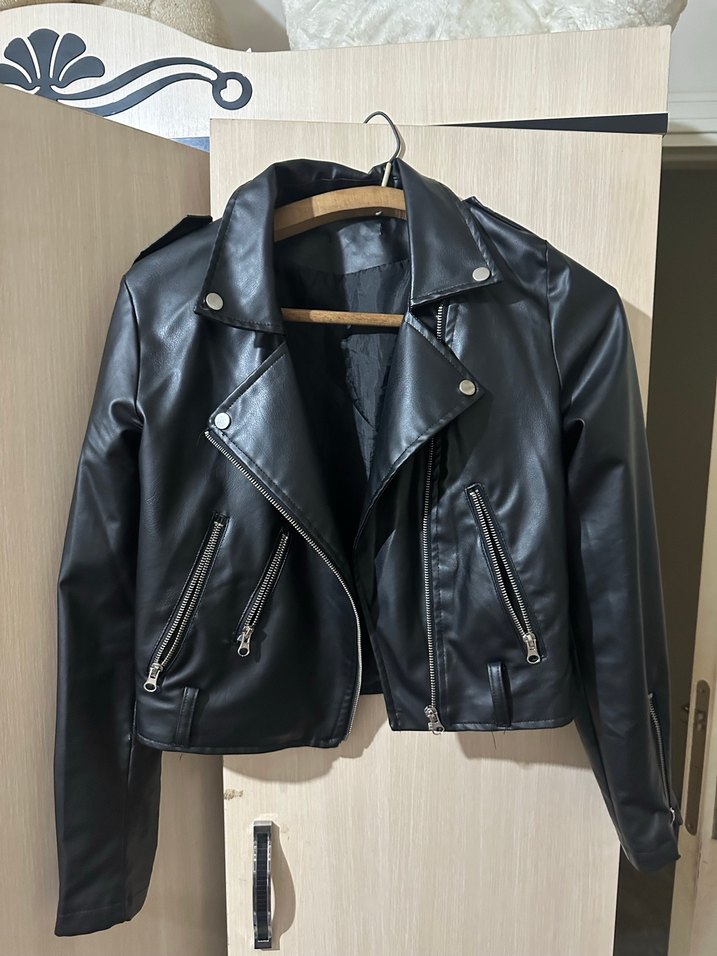 Bu siyah deri biker ceket, fitted kesimi, notched yaka ve tokalı detaylarıyla dikkat çeker. Strappy kollu ve normal uzunluktadır, gündelik kullanıma uygundur.