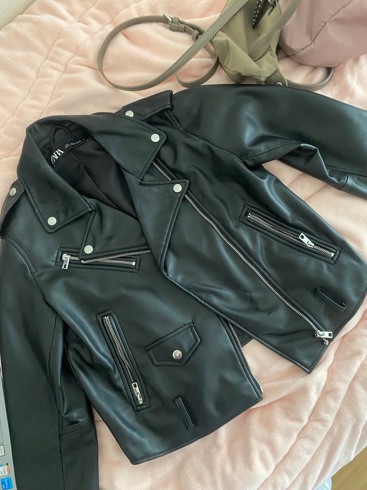 Bu siyah deri biker ceket, keskin yaka ve çoklu fermuarlı ceplere sahiptir. Strappy kollu ve midi boyda, grunge punk tarzı için uygundur.