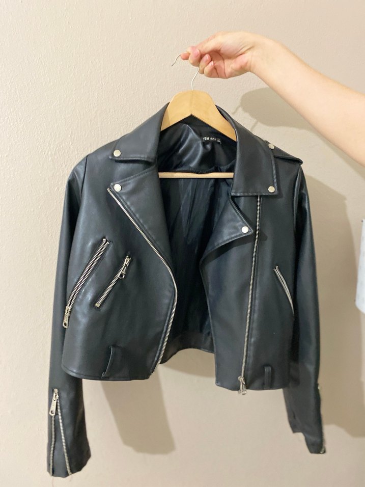 Fermuarlı detaylara ve kesik yakaya sahip, siyah deri ve dar kesim biker ceket