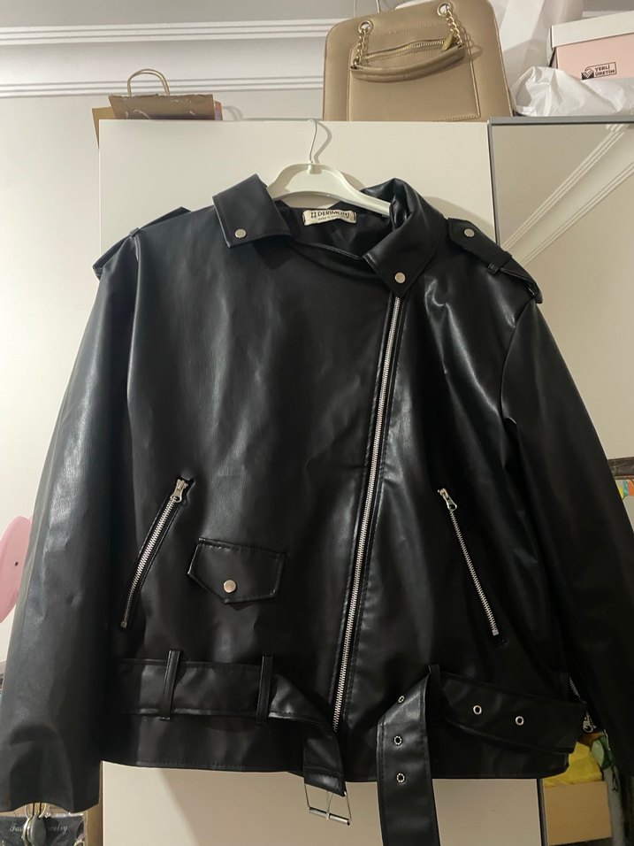 Siyah deri biker ceket, kemerli detaylara ve vücuda oturan kesime sahiptir. Çentikli yaka ve fermuarlı cepler bulunur, sokak stiline uygundur. sol cebin üst kısmında küçük bir sökük vardır o da dikilit kapatınca belli olmuyor L , XL uyumlu