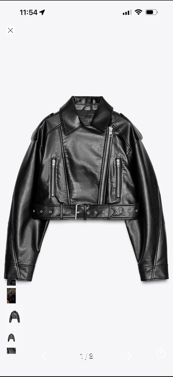 Siyah deri biker ceket, kemerli ve askılı kollu. Çentikli yaka ve normal kesim, günlük kullanıma uygun.