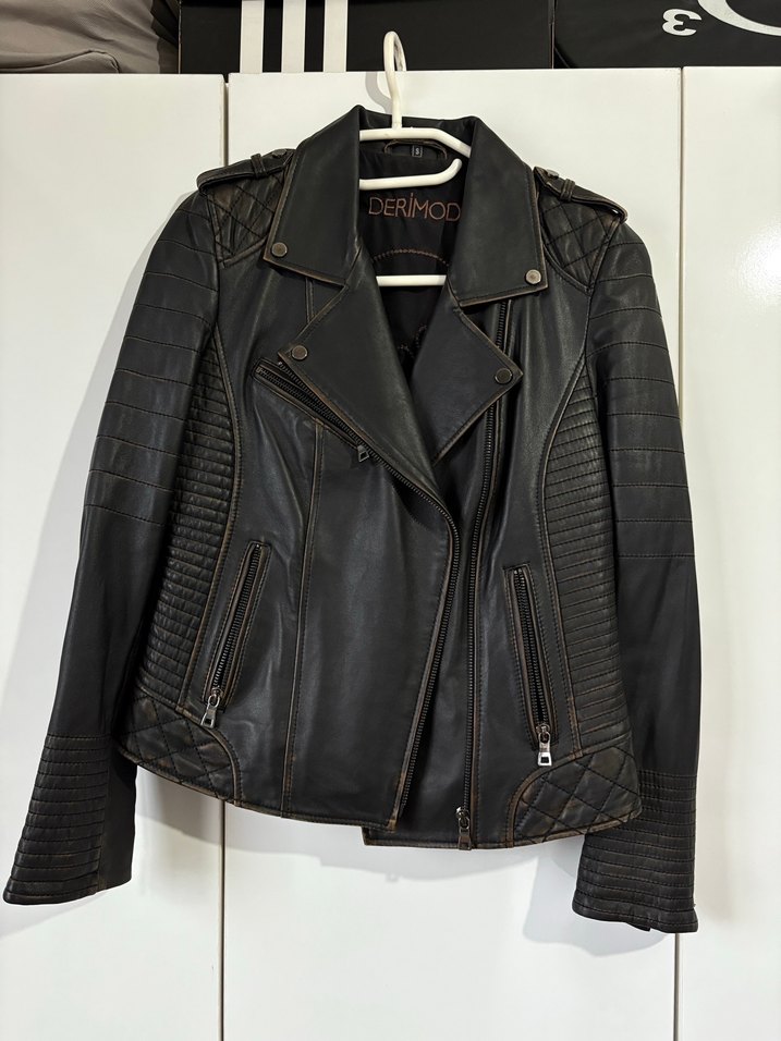 Siyah deri biker ceket, kesik yakalı, tokalı detaylara ve fit kesim.Vücuda komple oturuyor.Eskitme ama az kullanıldı.