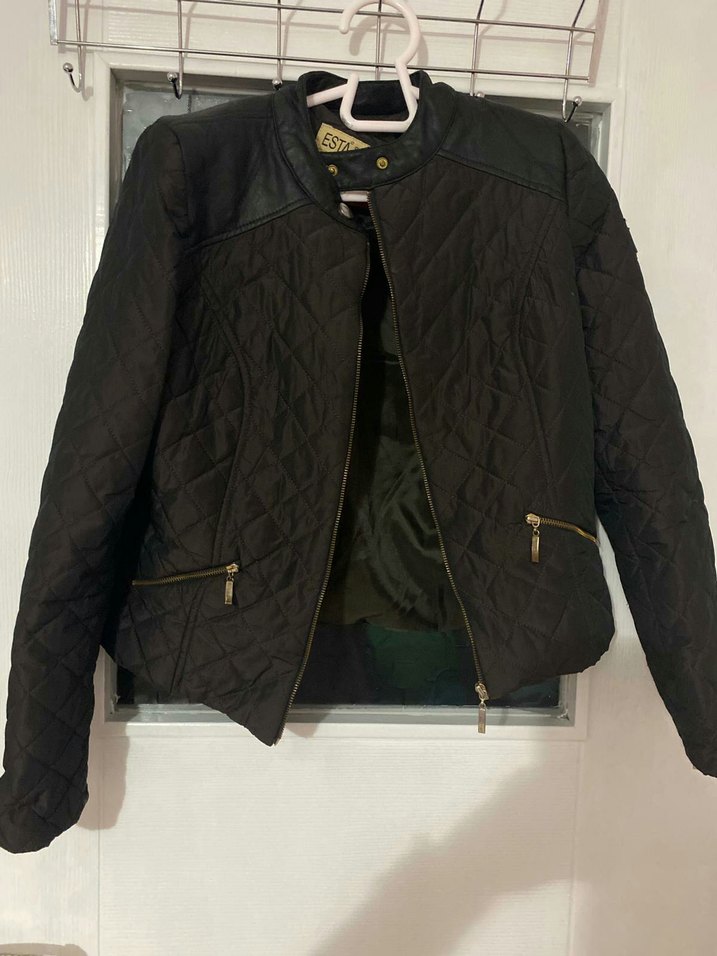 Fermuarlı cepleri ve yaka detayıyla siyah deri biker ceket, uzun kollu ve normal midi boyda, sokak stiline uygun günlük kullanıma ideal. sorunsuz m l olur. yurtdisi ürünü estaline markasi