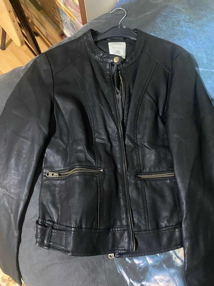 Kadın siyah deri biker ceket, fitted kesim, yakasında kesik detay ve uzun kollu. Fermuarlı cepler ve tokalı detaylar bulunur.