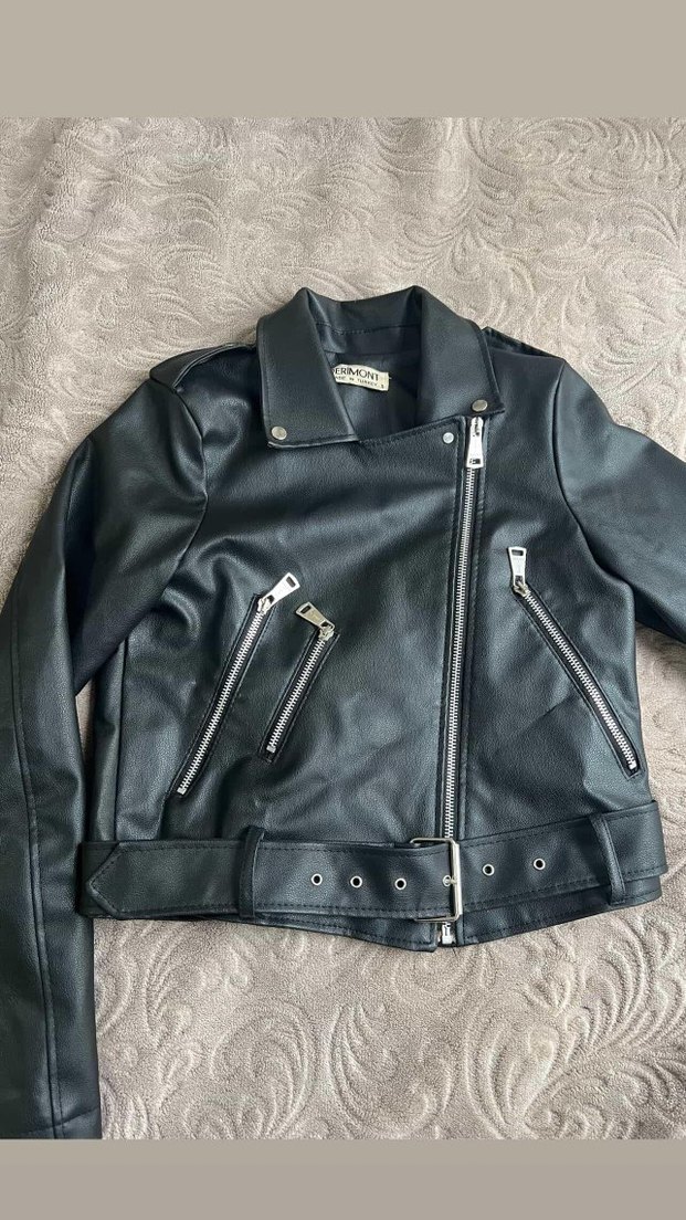 Kadınlar için siyah, dar kesim deri biker ceket. Fermuarlı cepler, kesik yaka, askılı kollar ve kısa boy ile trendy gündelik tarz için uygun.
