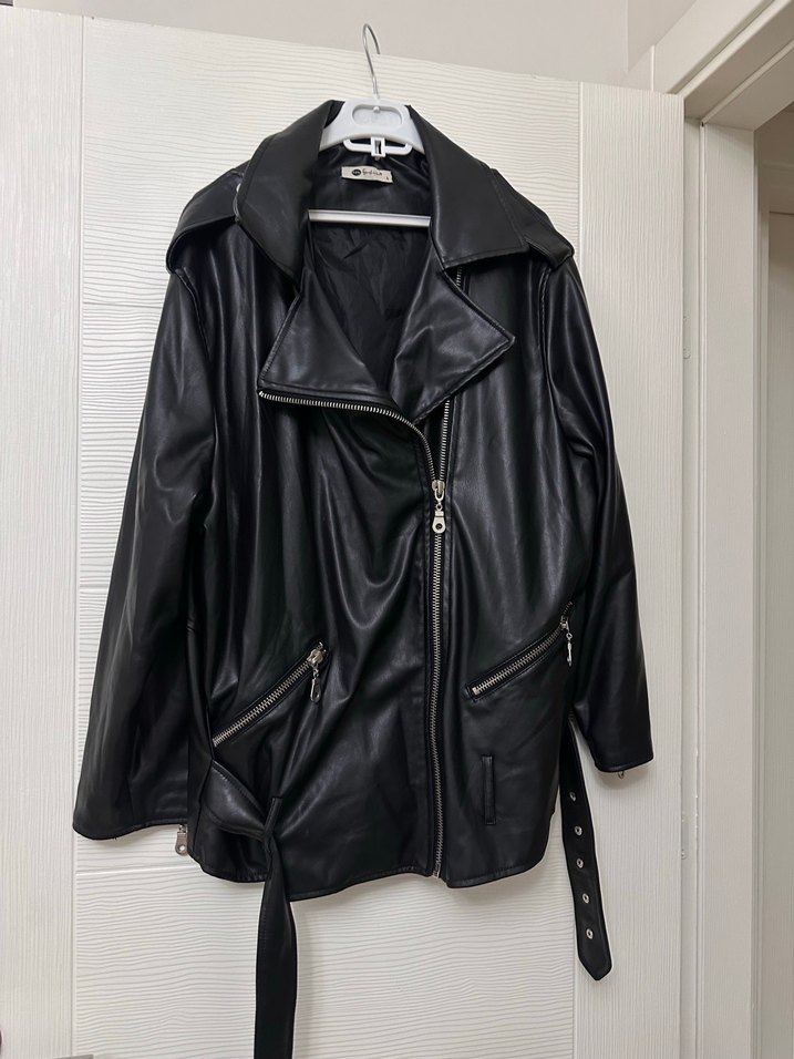 Siyah deri biker ceket, kesik yakalı ve kemerli bel detaylı. Bol kesim, askılı kollu ve fermuarlı ceplidir, günlük kullanım için uygundur.