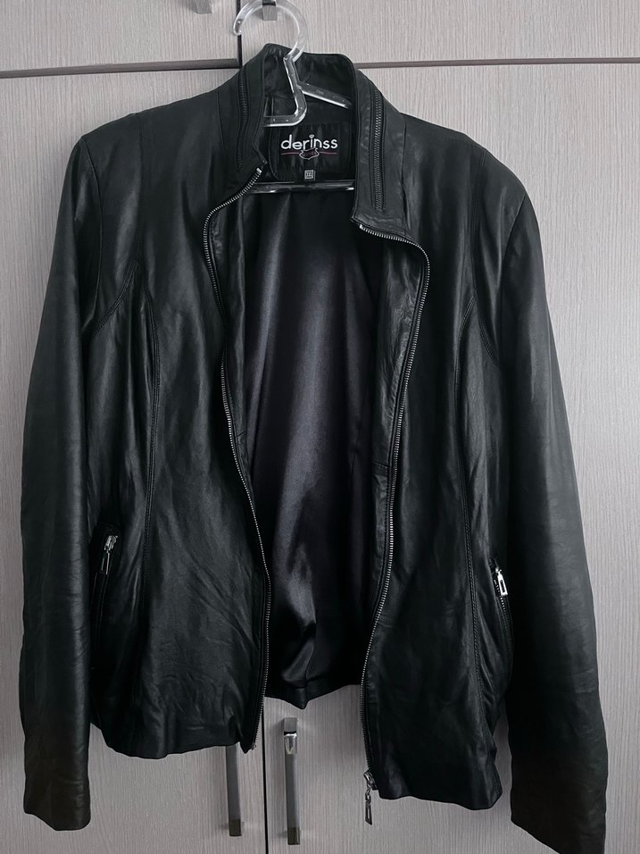 Siyah, fitted deri biker ceket, yakalı ve fermuarlı ceplidir. Marka: derinss. kalıbı dardır. herhangi bir kusuru yok artık giymediğim için satıyorum