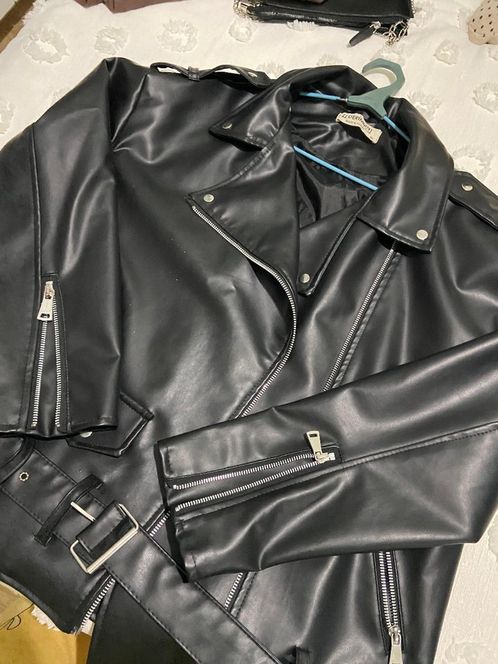 Fıt kesim siyah deri biker ceket, yakalı, tokalı ve fermuarlı kollara sahiptir. Günlük kullanım için uygun, sokak stilini yansıtır.