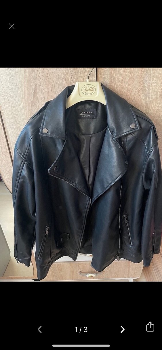 Siyah deri biker ceket, kesik yaka ve fermuarlı ceplerle. Normal kesim, askılı kollu, günlük şık kullanıma uygun.