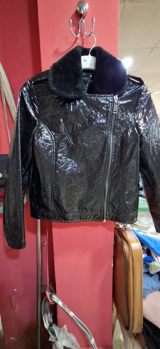 Siyah deri, fermuarlı biker ceket, kesimi vücuda oturur, notched yaka ve midi boyda. Parti için uygun, strappy kollu şık tasarım. cok iyi durumda l beden