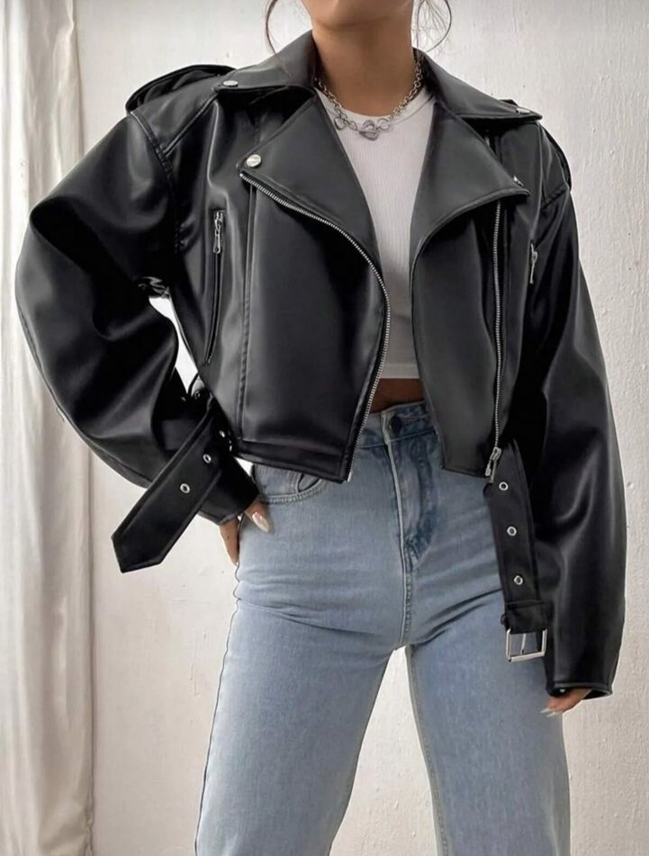 Siyah deri, kemersiz ve oturan kesim biker ceket. Notlu yakalı, askılı kollu, midi boyda, günlük sokak stiline uygun. Çok fazla kullanmadım yeni gibifir yenidinden farkı yok.Satma sebebim bu ceketimi artık çok fazla kullanmamsm yoksa hiç bir yerinde sorun yok