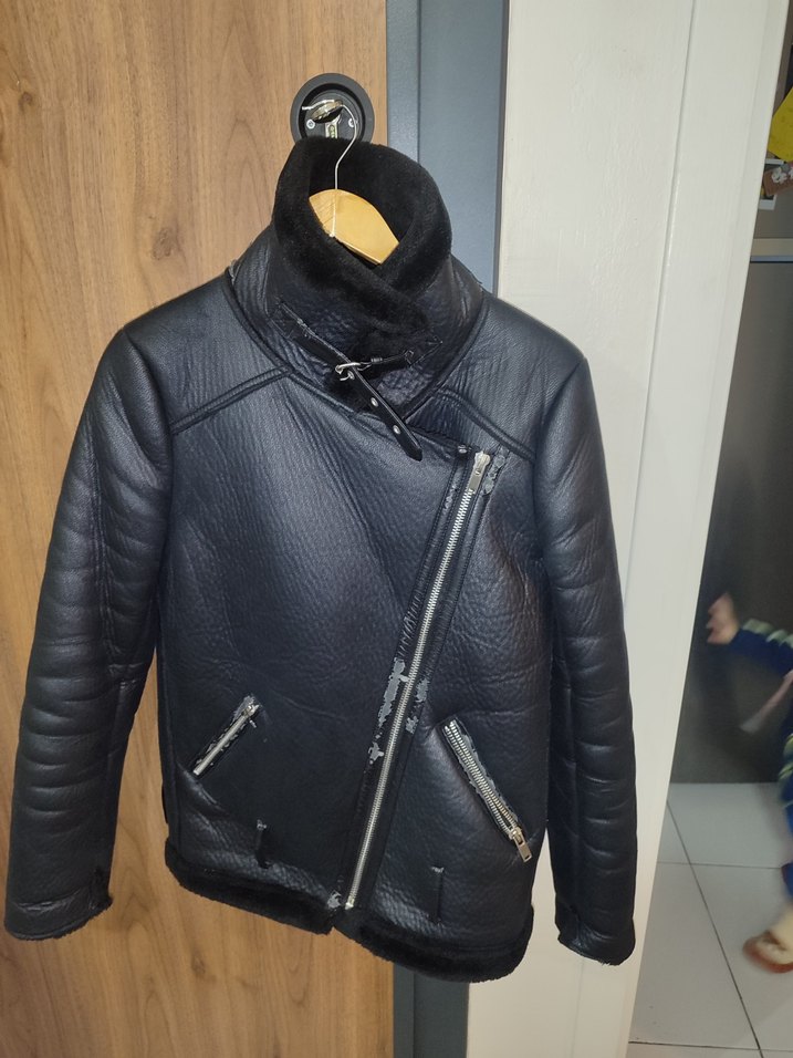 Siyah deri ceket, kesik yaka ve fermuarlı ceplerle. Strappy kollu, , modaya uygun bir tarz sunar. defoları mevcuttur. resimlerde gösterilmiştir.