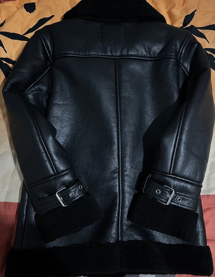 Siyah deri biker ceket, kesik yaka, askılı kollar ve tokalı manşetlere sahiptir. Günlük kullanım için uygun, vücuda oturan midi boydadır. Üründe herhangi bi defo leke mevcut değildir. Bedeni S beden Oversize model Pazarlık mevcuttur