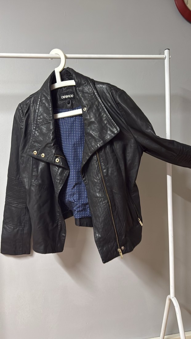 Siyah deri biker ceket, kesimli yaka, askılı kollar ve kemerli bel ile şık bir görünüm sunar. Midi boyu ve desensiz yapısıyla günlük sokak stiline uygundur. Omuz arası 42 boy53 cm