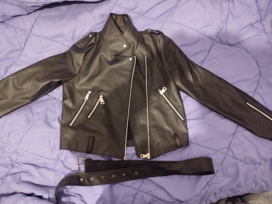 Notched lapel detaylı, tokalı kemerli, fermuarlı siyah suni(?) deri kısa biker ceket. İnce kesim ve askılı kollarla günlük kullanıma uygun.