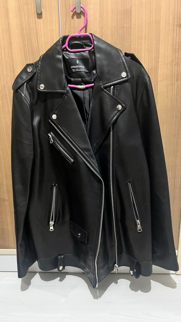 Siyah deri biker ceket, çok giyilmedi ancak dolapta durduğu için sanıeım yakasınaa aşınma mevcut