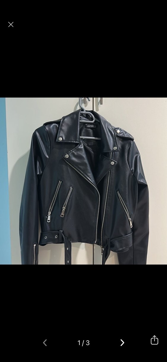 Siyah, kadın deri biker ceket. Kemer tokalı, fermuarlı cepli, yaka kısmı kesik ve askılı kollu, sıkı kesim, rock punk tarzında.