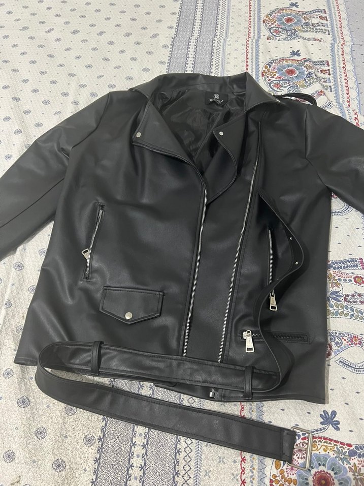Siyah deri biker ceket, oturan kesim, kesik yaka ve tokalı detaylara sahip. Kayışlı kolları ve midi boyu sadece 1 kez giyildi bana büyük geldiği için satıyorun yoksa çok güzel bir ceket