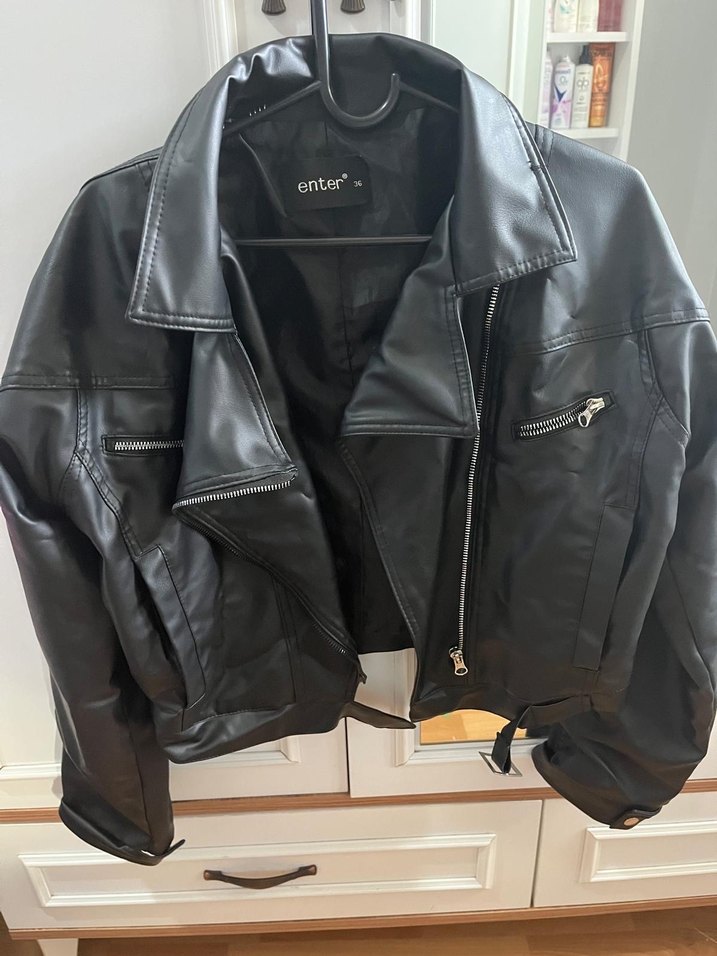 Siyah deri biker ceket, oturan kesim, normal boy ve keskin yakaya sahip. Tokalı ve fermuarlı cepleriyle günlük şıklık sağlar. Hiçbir sorunu yok kısa beden olmadığı için satıyorum