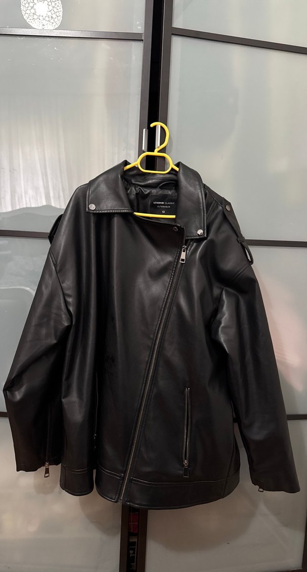 Siyah deri biker ceket, çıtçıtlı yakalı ve fermuarlı, tokalı detaylara sahip. Rahat kesim ve normal boyda, günlük kullanım için uygundur. Büyük bedenlere rahatlıkla olacaktır.