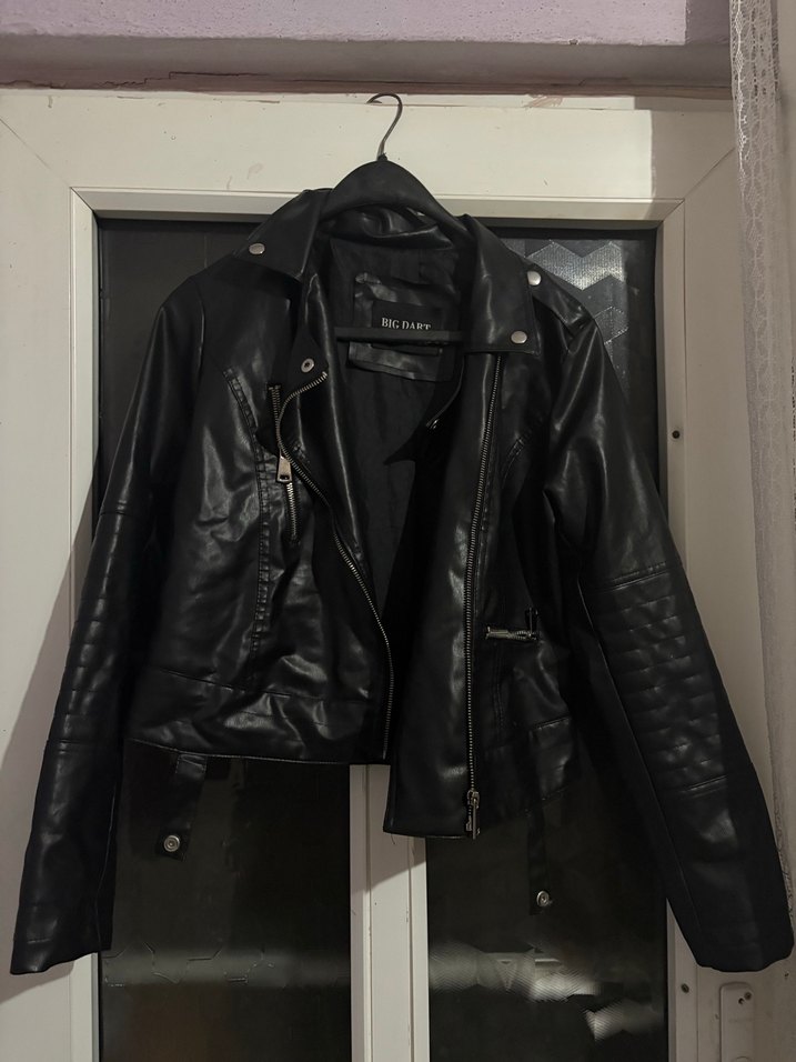 Siyah deri biker ceket, oturan kesim, tokalı detaylar ve kesik yakaya sahiptir. Kayışlı kollu, midi boyda ve rock punk tarzını yansıtır.
