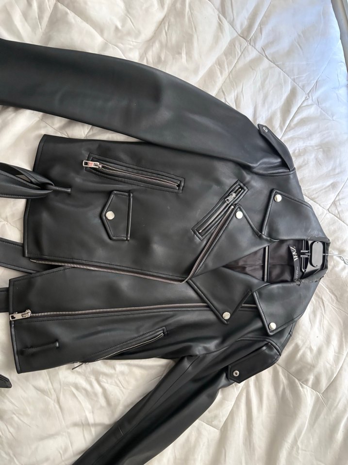 Fermuarlı ve tokalı detaylara sahip, siyah deri, fitted kesim kadın biker ceket. Notlu yaka ve midi uzunlukta, şık ve modern görünümlü. Ense kısmında soyulma var