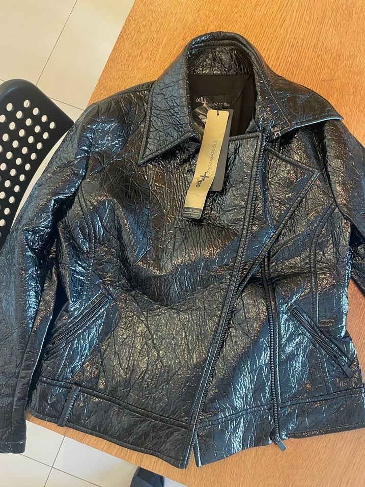 Siyah deri biker ceket, belden oturan kesim ve askılı kollara sahip, tokalı detaylar ve kesik yaka ile tamamlanmıştır. Günlük kullanıma uygun grunge punk tarzı.