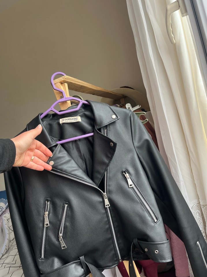 Bu dar kesim siyah deri biker ceket, kesik yaka ve fermuarlı ceplere sahiptir. Normal boyu ve baskılı tasarımıyla günlük kullanıma uygun Paris tarzı bir görünüme sahiptir. 2 .3 defa giyildi temiz durumda fazlalıktan dolayı satıyorum