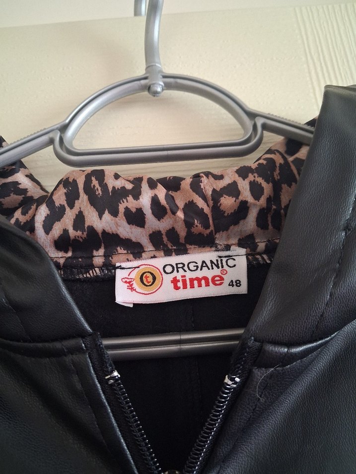 Fermuarlı, kapüşonlu siyah deri biker ceket, baskılı astarlı ve dar kesim. Trend sokak stili için uygundur.