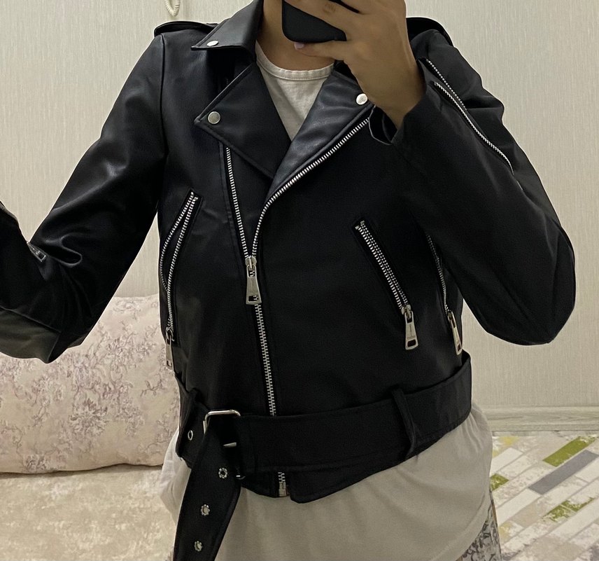 Bu siyah deri biker ceket, kemerli ve kesik yaka detaylıdır. Normal midi boyu ve askılı kolları ile günlük kullanıma uygundur.
