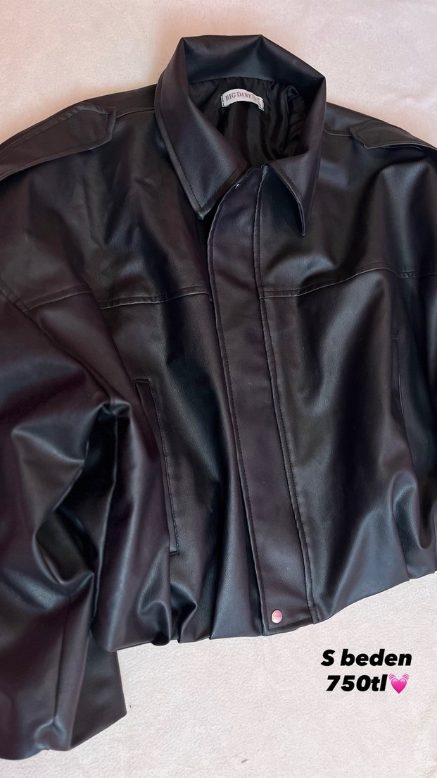 Siyah, deri biker ceket, yakalı ve düğmeli. Uzun kollu, normal uzunlukta ve bol kesim. S beden, fiyatı 750 TL.